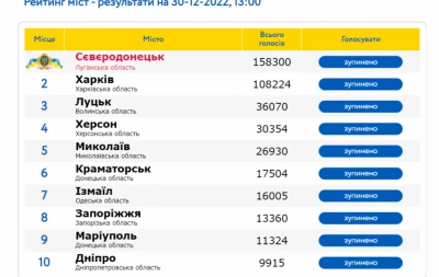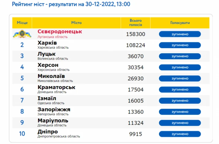 "Сєвєродонецьк - це Україна! Серед усіх міст країни - тимчасово обласний центр обрали містом року. Загалом у голосуванні взяли участь понад два мільйони українців. Дякуємо всім тим, хто підтримав Сєвєр", - зазначається в повідомленні.