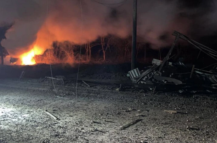 Про це повідомив заступник керівника Офісу Президента України Кирило Тимошенко. На фотографії з місця удару можна побачити воронку від ракети, пожежу та руйнування.