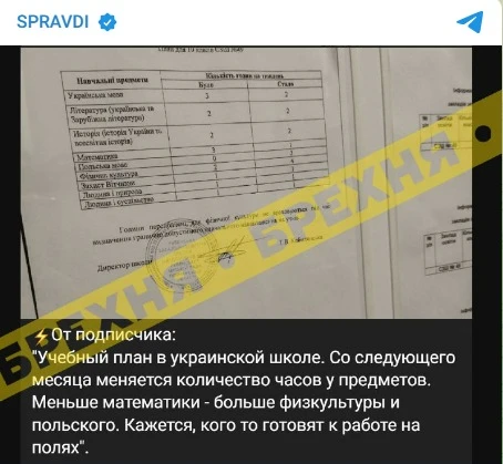In February 2023, Russian propagandists said that children in Ukraine would have less mathematics lessons, but more physical education and Polish ones. In this way they are "prepared to work in the fields".