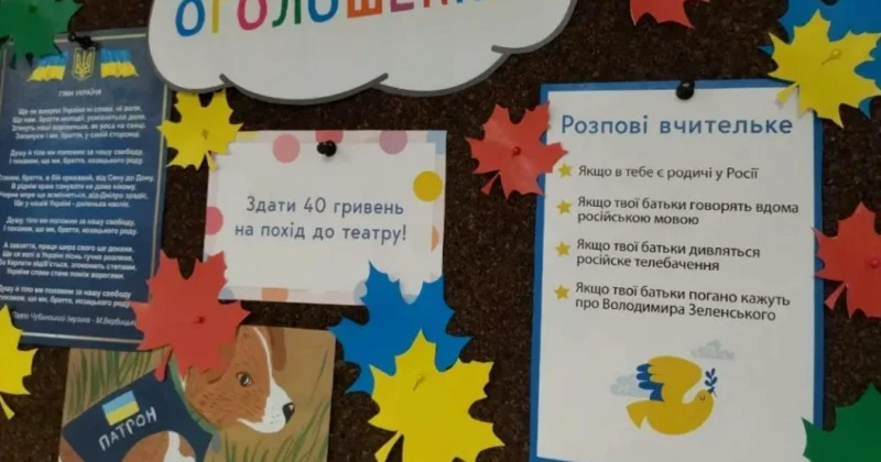 The author of the news allegedly received photo evidence from one of the educational institutions in the controlled territory of Ukraine, which shows that children are forced to inform on their parents. The photo shows a school bulletin board. There is a poster with the words of the Ukrainian national anthem, an image of Patron the dog and an announcement about the donation of 40 hryvnias for a trip to the theater.