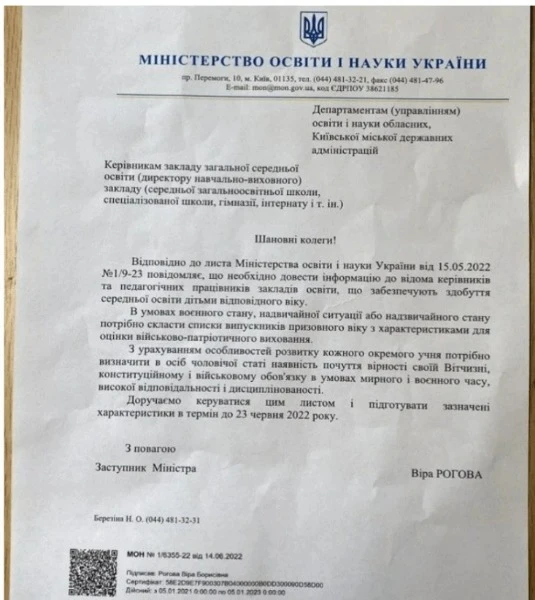 The Russians also spread a fake letter, allegedly signed by Vira Rogova, the Deputy Minister of Education and Science. The letter gives instructions to the heads of educational institutions and orders to make lists of draft-age graduates with characteristics of military-patriotic education assessment.
