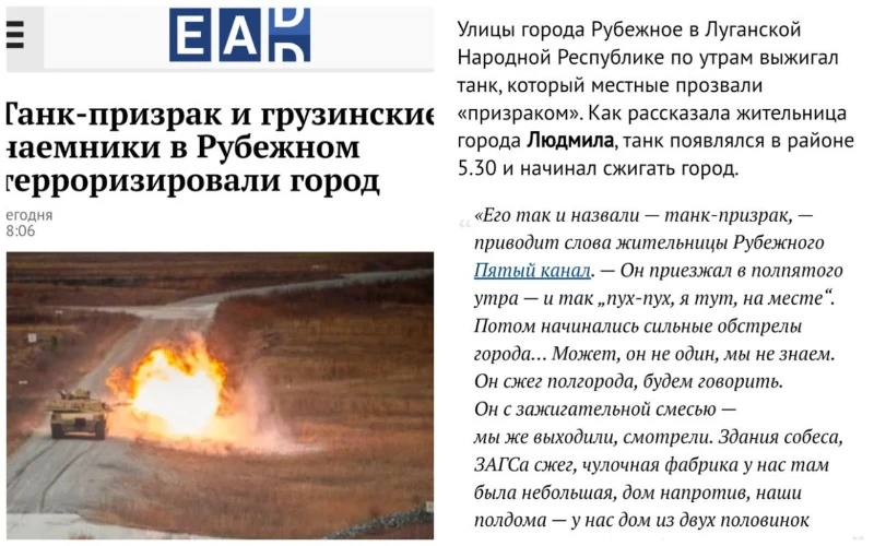 В публикации от 12.04.22 ресурса "EADaily" утверждается, что половину города "сжег танк - призрак".