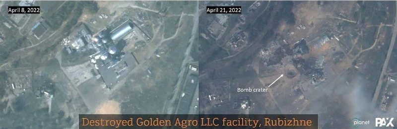 Однако спутниковые снимки Planet Lab свидетельствуют о том, что на территорию ООО "ГОЛДЕН АГРО" в Рубежном были сброшены мощные российские бомбы еще в апреле. Уже тогда открытый в 2020 году элеваторный комплекс был полностью уничтожен.
