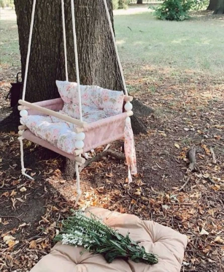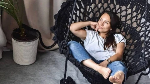 Говорит, что они с семьей ремонтировали диван, и от него осталась ткань, которую женщина и использовала для производства качелей. Евгения говорит, что посмотрела в интернете схему работы, потом купила крепеж для работы в строительном магазине, нашла дома ненужный канат и начала воплощение желаемой идеи.