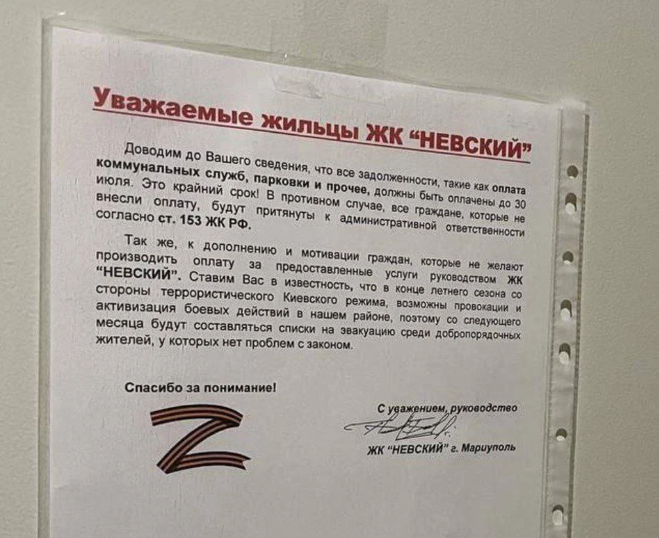 Фото объявления в жилом комплексе "Невский" обнародовал Мариупольский городской совет в Telegram.
