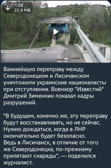 По их словам, этот мост ВСУ взорвали перед отступлением. Хотя украинские войска отступили из Северодонецка аж 24 июня 2022 года.