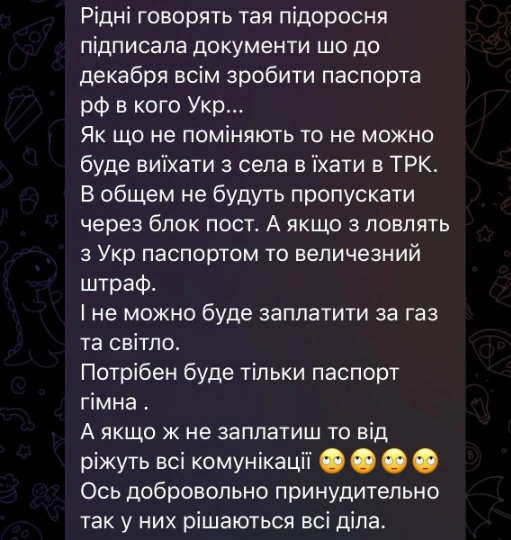"Почему я называю такие угрозы манипулятивными? Во-первых, пока нет четких сроков получения паспортов РФ (по крайней мере, единой позиции по этому поводу не объявлялось ни на ранее захваченных, ни на вновь оккупированных территориях). Термины, которые называются, зависят, наверное, от плана паспортизации и его выполнения коллаборационными органами власти", – отметила координатор Донбасс СОС. – Действительно ли оккупанты выполнят угрозы, к которым они прибегают – никто не может ни подтвердить, ни опровергнуть. Ведь нельзя быть уверенными в чем-то на территориях, где не действуют законы”.