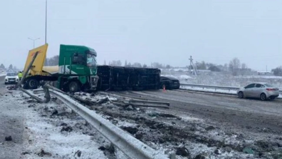По информации Патрульной полиции, утром на трассе вблизи Полтавы перевернулся грузовик Renault Magnum.