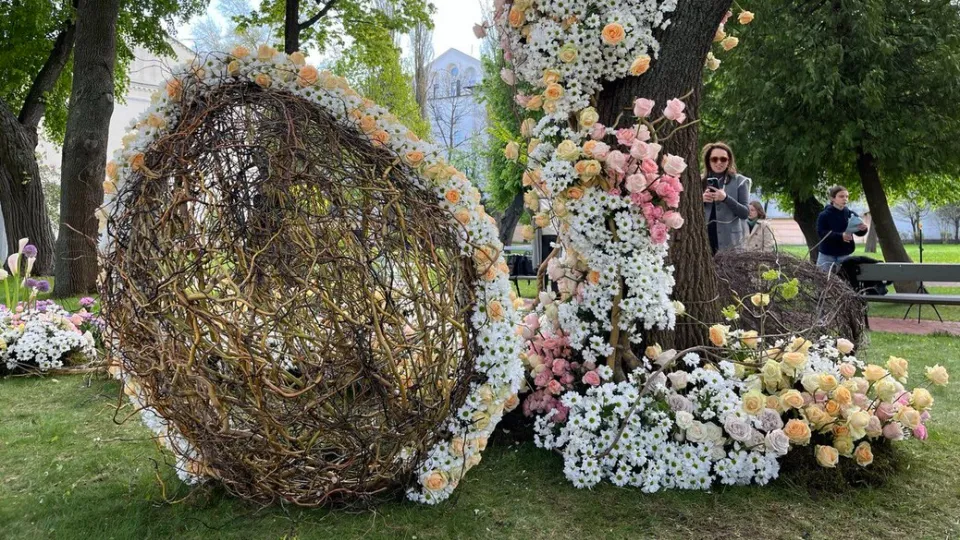 В Национальном заповеднике "София Киевская" презентовали инсталляцию цветов от украинских флористов. Это социальный проект "Пасхальные выходные". В комментарии Общественному соорганизатору мероприятия мастер флористка Елена Дрючан рассказала, что в инсталляции использовали около 3 тысяч 500 цветов.