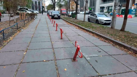 На улице Антоновича, 86-94, в Киеве появилась стоянка на тротуаре. Ее сделали жильцы дома за свой счет, однако столичные власти решили не трогать столбики, ограждающие "парковку".