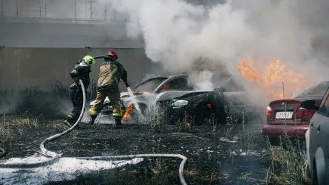 Произошло возгорание автомобилей на парковке. На момент прибытия спасателей пожар быстро распространялся на рядом расположенные автомобили.