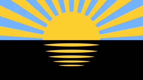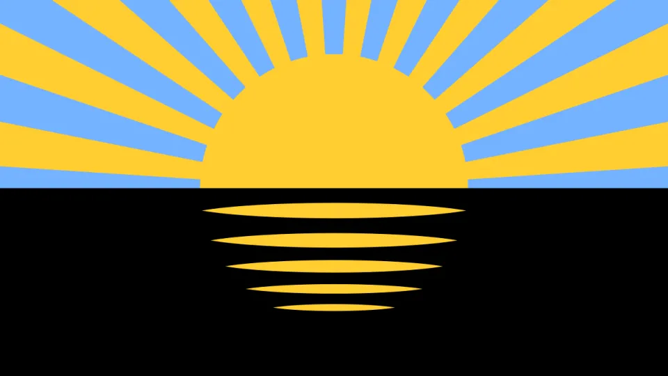 Верхнее поле имеет голубой цвет и символизирует небо. На нем изображено восходящее золотое солнце, диаметр которого составляет 2/5 длины флага. Солнце имеет двенадцать лучей, расположенных под углом 15 градусов, а размер каждого луча составляет 7,5 градуса.