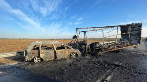 После этого грузовой автомобиль столкнулся “лоб в лоб” со встречной машиной “Opel Zafira”. От сильного удара обе машины загорелись.