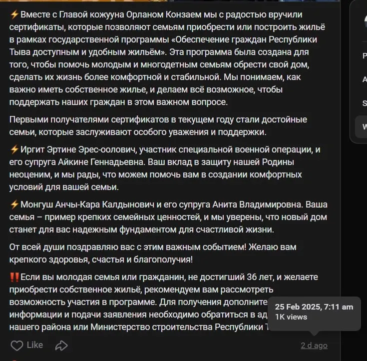 UPD: Эта информация оказалась частично правдивой. Редакция ТРИБУН узнала, что многодетная семья из Тывы действительно получила сертификат на покупку квартиры, только не в Мариуполе, а в своем регионе, где они и проживают. Добавляем оригинальный пост.