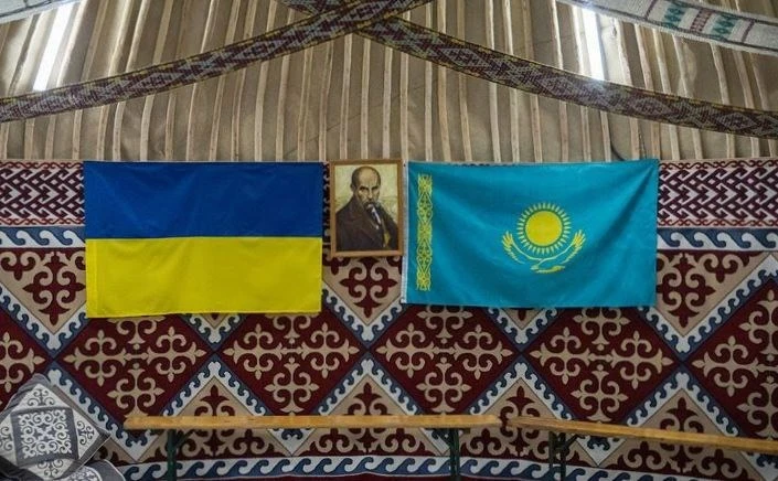Внутри юрты висят флаги Украины и Казахстана, а такеже портрет Тараса Шевченко. Также там можно было увидеть предметы обихода казахов: посуду, оружие, национальные костюмы.