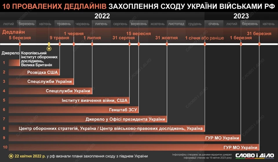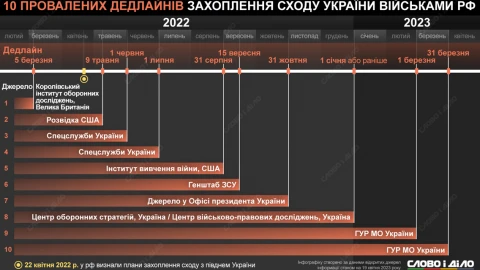 Перший провалений термін стосувався навіть не сходу, а всієї країни: за інформацією британського Королівського інституту об'єднаних сил, Росія минулого року планувала захопити всю Україну за десять днів, тобто орієнтовно до 5 березня.
