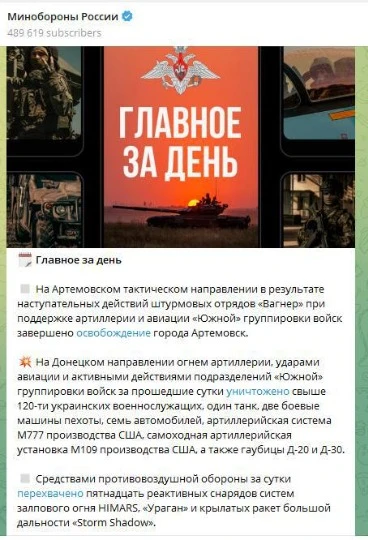 «На артёмовском тактическом направлении в результате наступательных действий штурмовых отрядов «Вагнер» при поддержке артиллерии и авиации «Южной» группировки войск завершено освобождение города Артёмовска», — написали в повідомленні.