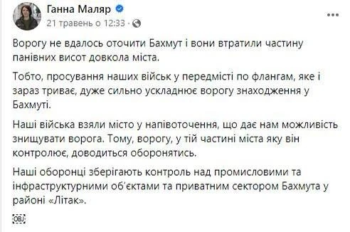 Втім в Україні на офіційних сайтах влади і Міністерства оборони ніякої інформації про втрату Бахмута немає. Про ситуацію в місті-фортеці на своїй сторінці в Фейсбук написала заступниця міністра оборони України Ганна Маляр. Вона спростувала інформацію про «взяття» російськими терористами українського міста. Зазначила, що бої тривають, і українські бійці не втрачають позиції.