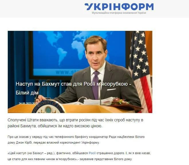 Поки росіяни радіють вигаданим новинам про успіхи свого війська і хоч якось замаскували свої втрати, перевівши увагу на так звані успіхи. В цей час Пентагон дає свої оцінки ситуації. Координатор Ради нацбезпеки Білого дому Джон Кірбі в телефонному брифінгу повідомив, що для Росії Бахмут став справжньою м‘ясорубкою.