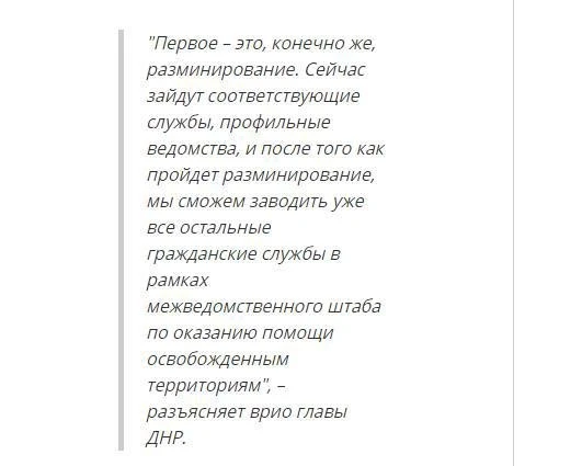 "Первое – это, конечно же, разминирование. Сейчас зайдут соответствующие службы, профильные ведомства, и после того как пройдет разминирование, мы сможем заводить уже все остальные гражданские службы в рамках межведомственного штаба по оказанию помощи освобожденным территориям", – каже в сюжеті Пушилін.