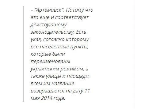 "Артемовск". Потому что это еще и соответствует действующему законодательству. Есть указ, согласно которому все населенные пункты, которые были переименованы украинским режимом, а также улицы и площади, всем им название возвращается на дату 11 мая 2014 года.