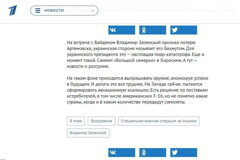 “На встрече с Байденом Владимир Зеленский признал потерю Артемовска, украинская сторона называет его Бахмутом. Для украинского президента это — настоящая пиар-катастрофа. Еще и момент такой. Саммит «Большой семерки» в Хиросиме. А тут — новости о разгроме.”