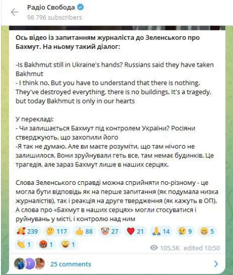 «- Чи залишається Бахмут під контролем України? Росіяни стверджують, що захопили його. - Я так не думаю. Але ви маєте розуміти, що там нічого не залишилося. Вони зруйнували геть все, там немає будинків. Це трагедія, але зараз Бахмут лише в наших серцях».