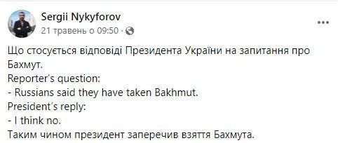 “Що стосується відповіді Президента України на запитання про Бахмут.