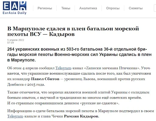 Втім, подібні новини російські пропагандистські медіа поширювали з початку війни. Навесні минулого року вони розігнали новину про здачу в полон цілого батальйону українських морпіхів. Нібито 264 українських воїни-піхотинці просто після загибелі командира здалися в російський полон.
