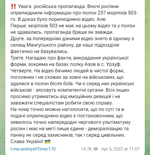 А ще за деякий час спростування з'явилося на телеграм сторінці. Із поясненням, що на відео насправді немає українських піхотинців. Крім того, неодноразово були зафіксовані факти викрадення української військової форми, зокрема на базах полку Азов. Тож можливо росіяни просто перевдягли в форму цивільних і записали відео, нібито як здаються українські військові.