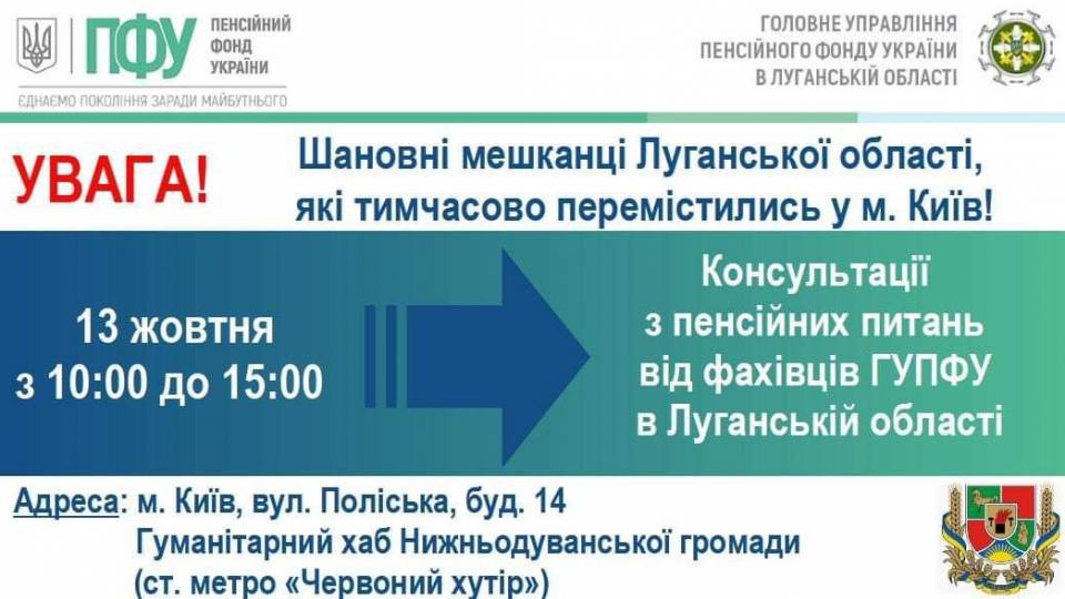 13 жовтня відбудеться прийом спеціалістами ГУ ПФУ в Луганській області внутрішньо переміщених осіб. Звернутися за розв'язанням пенсійних питань можна з 10:00 до 15:00 до хабу Нижньодуванської громади.