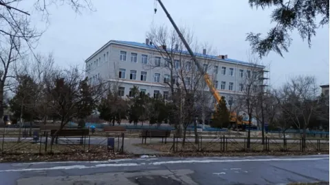 На фото: розмальована у російський триколор понівечений дитячий майданчик по вул. Курчатова 19, 10 школа, багатоквартирні будинки, вул. Курчатова 5.