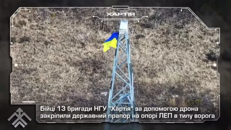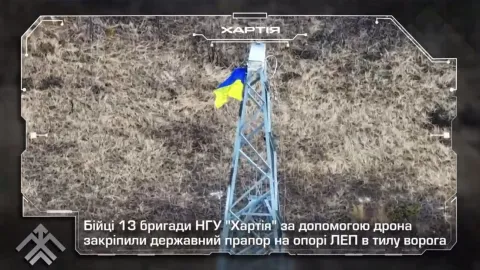 Державний прапор України за допомогою дрона було встановлено на опорі ЛЕП у Кремінських лісах.