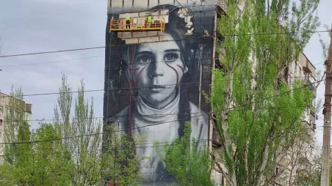 Скандальний мурал з дівчиною в Маріуполі, на яку "падають ракети НАТО", нарешті прибирають.