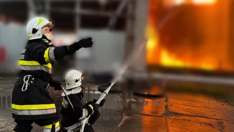 Рятувальники ліквідовують пожежу, що виникла внаслідок падіння уламків під час ворожої атаки.