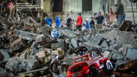 Оперативно-пошукові роботи тривали всю ніч. В “Охматдиті” рятувальники розбирають завали та демонтують зруйновані споруди.