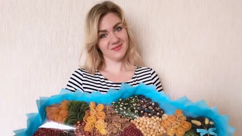 У мене можна замовити солодкі букети з шоколаду, маршмелоу, печива, зефіру, цукерок; букети із сухофруктів, рахат лукуму, горіхів, меду; чоловічі – із ковбасок, сиру, рибки, снеків; фруктові і ягідні букети із полуниці, черешні, лохини, ківі, кокосу, мандаринів. Також роблю різдвяні і новорічні букети та декор, кошики до Великодня, тощо. В кожну свою роботу я вкладаю душу і намагаюсь догодити кожному.