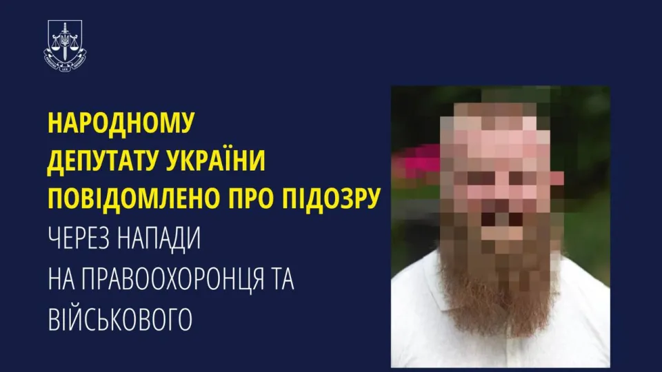 Слідчі оголосили про підозру за 4 статтями народному депутату через напад на співробітника правоохоронних органів та військовослужбовця. Можливо, йдеться про Артема Дмитрука.