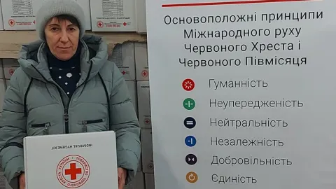 Триває видача гігієнічних наборів від Товариства Червоного Хреста України в Нижньодуванському хабі в Харкові.