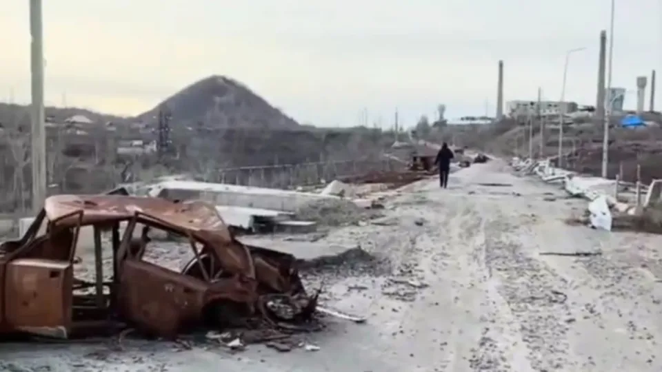 У результаті бойових дій на Луганщині міст зруйновано. На руїнах залишається спалена техніка.