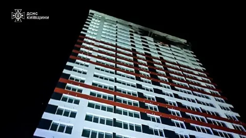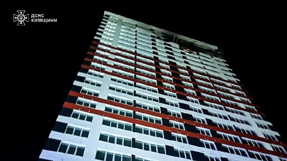 Внаслідок падіння уламків дрона в Броварському районі пошкоджений недобудований багатоповерховий будинок. Між 23 та 24 поверхом сталося загоряння, проте рятувальники оперативно загасили полум’я.