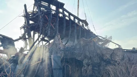 Пожежа знищила частину території, включно з кораблем, який повністю охопило полум’я. На відео з місця видно обгорілі конструкції, уламки меблів і згарище, яке ще тліє.