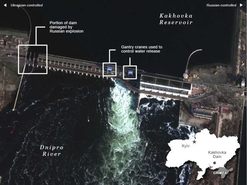 З початку листопада 2022 року вода витікає з Каховського водосховища на півдні України через шлюзи критичної гідроелектростанції, контрольованої російськими військами. У результаті супутникові дані показують, що рівень води у водосховищі впав до найнижчої позначки за три десятиліття.